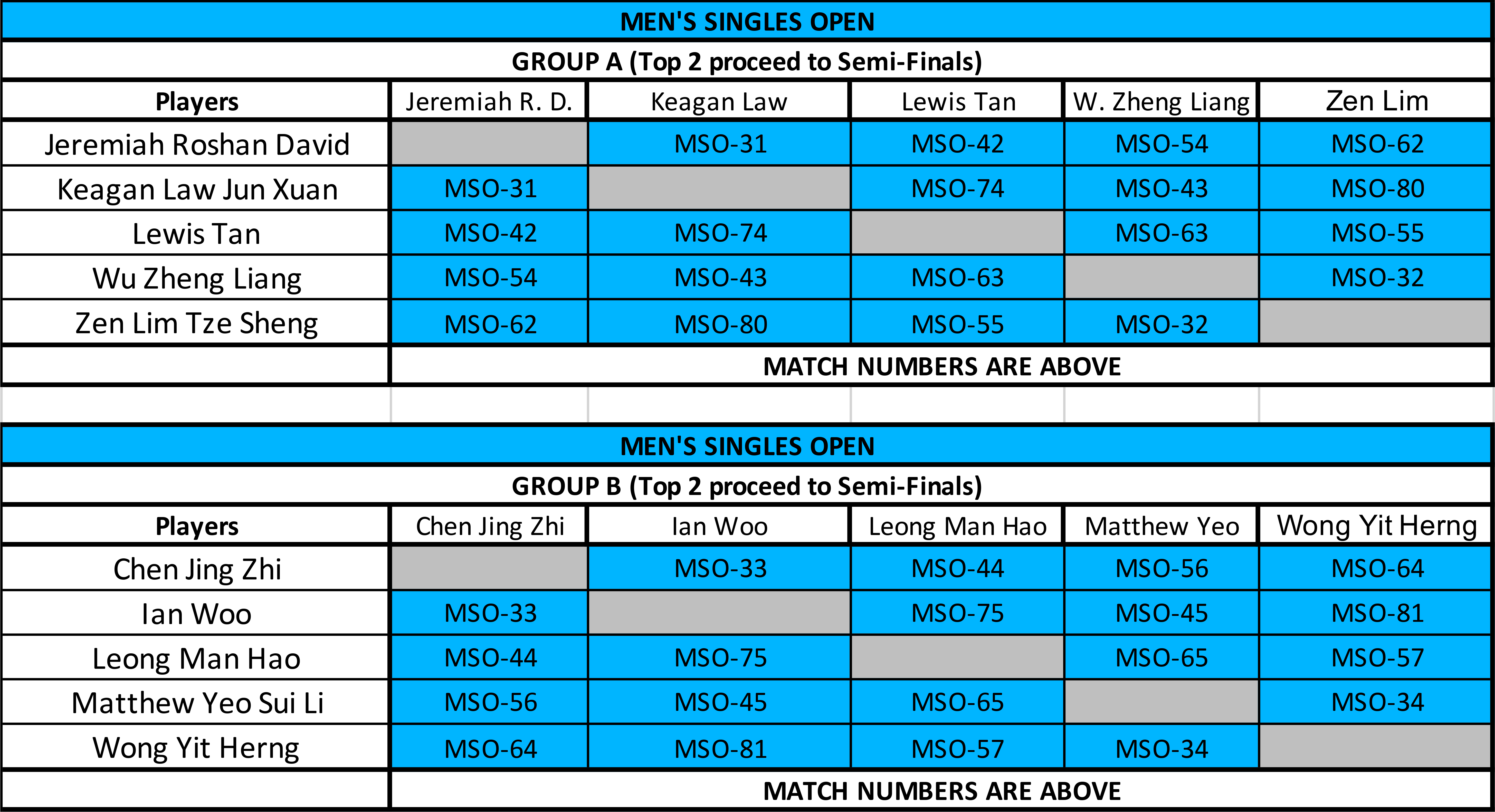 MEN'S SINGLES OPEN - (Fixtures)